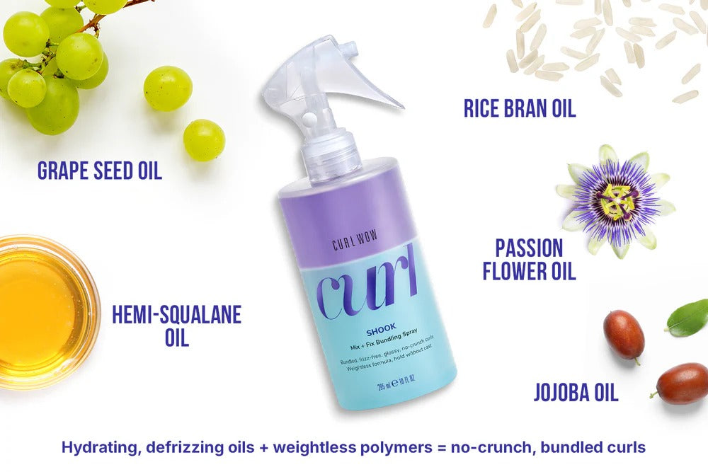 - Shook curl spray’s unique “shake-to-activate” bi-phase formula features one-part powerful, natural hydrating oils + one-part breakthrough curl-bundling polymers for bouncy, defined “naked curl” results